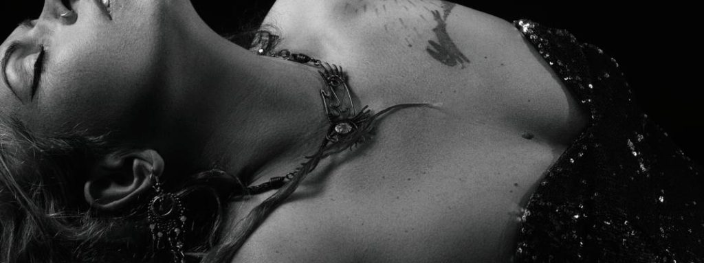 Woman dressed up to go out wearing chain mail bracelet and gecko pendant